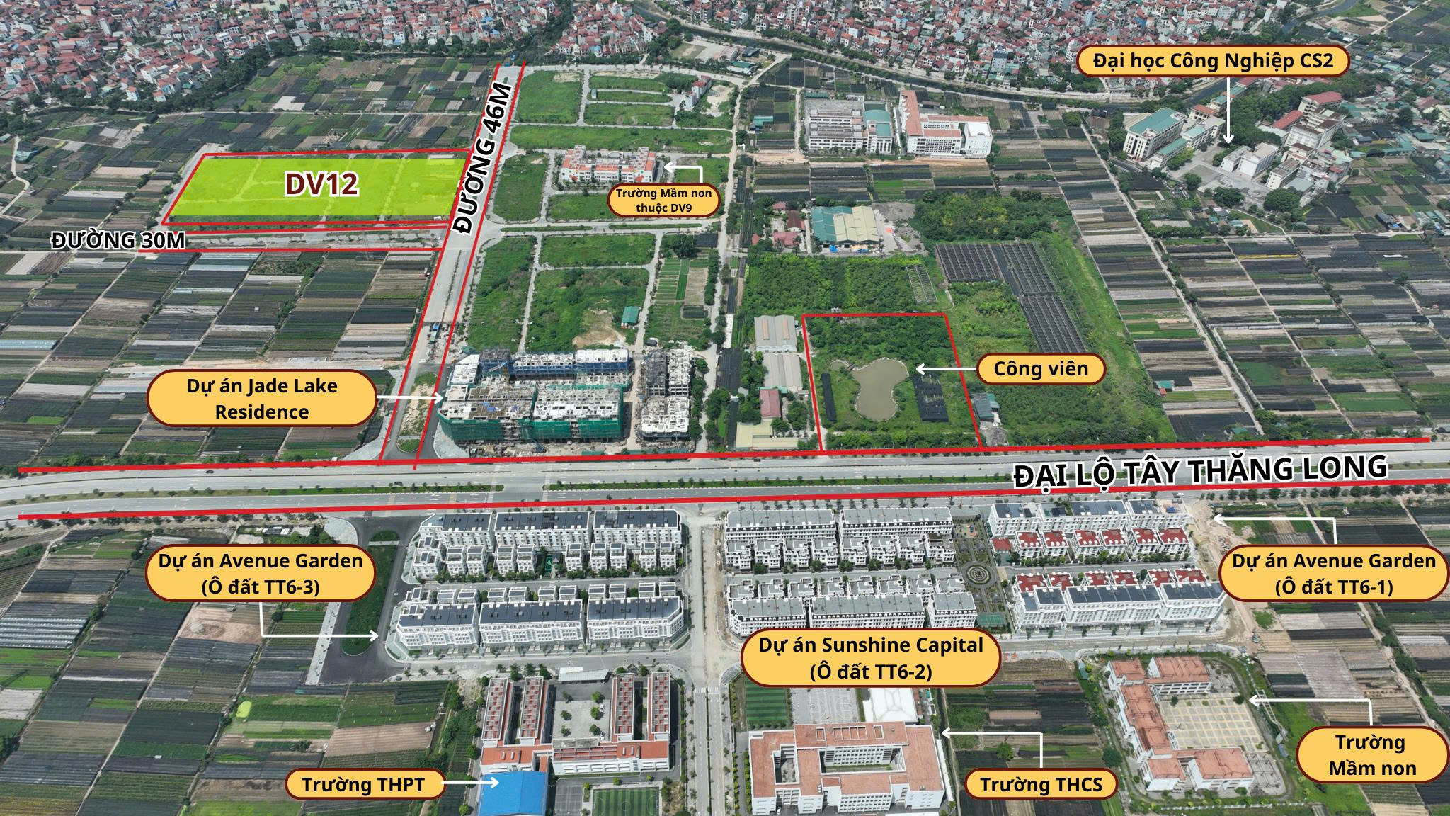 - Đường 46m: Là trục đường chính nội bộ của phân khu DV12 nói riêng và khu đô thị Tây Tựu nói chung. Trục đường này trực tiếp kết nối với tuyến đại lộ Thăng Long, Ba Vì – Tây Hồ…
