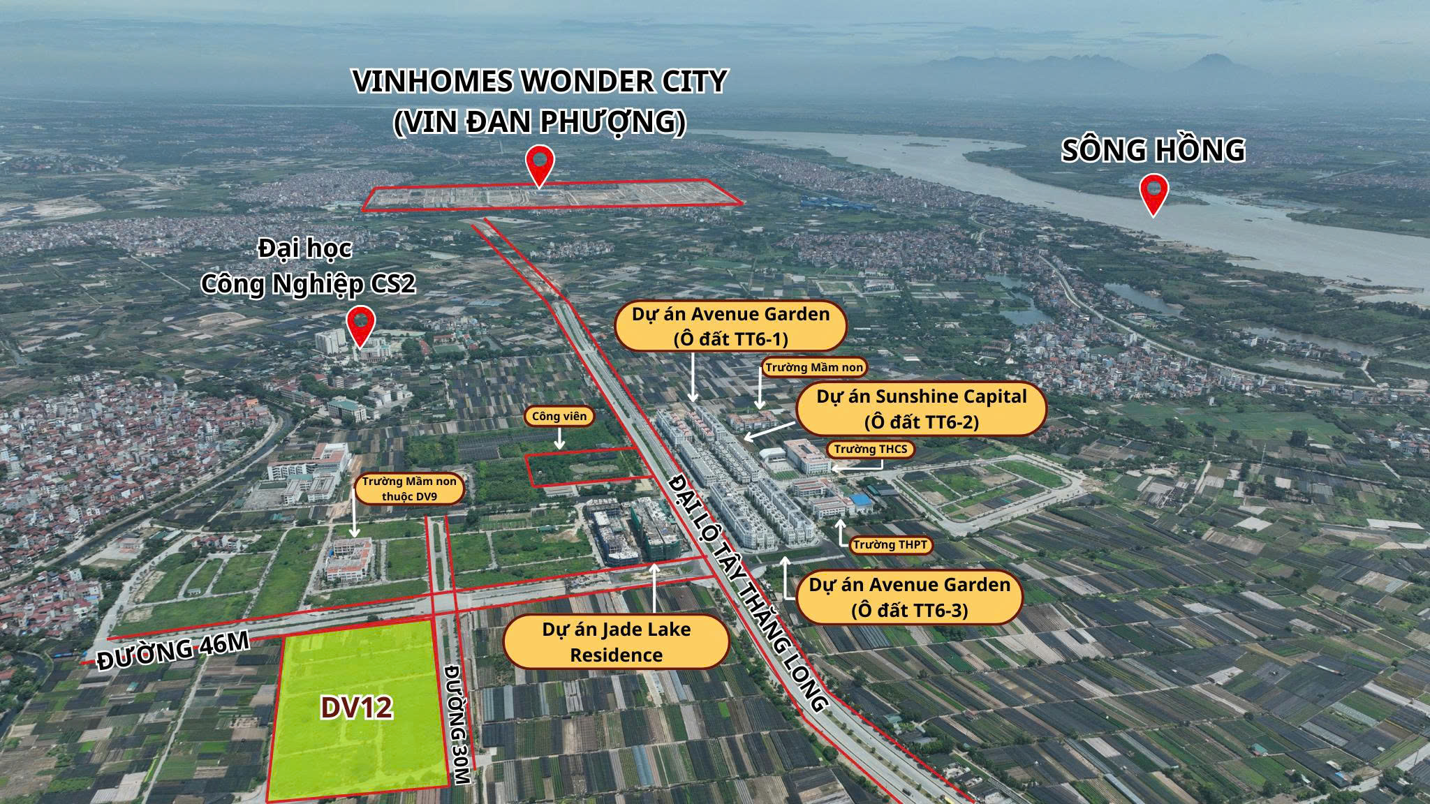 Phân khu DV12 được bao bọc bởi 4 tuyến đường lớn và quan trọng bậc nhất của dự án khu đô thị Tây Tựu. Đó là: